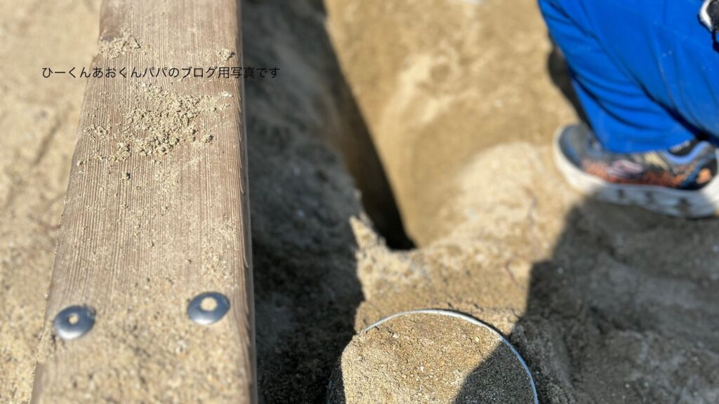 お山が高く完成したら、最後に山の下にトンネルを掘りましょう。両側からパパと子どもが手を入れ合って、砂の中で手が触れ合った瞬間の「開通した!」という喜びは格別です。ひーくんとあおくんに「パパすごい!」と言ってもらえる、最大の見せ場です。