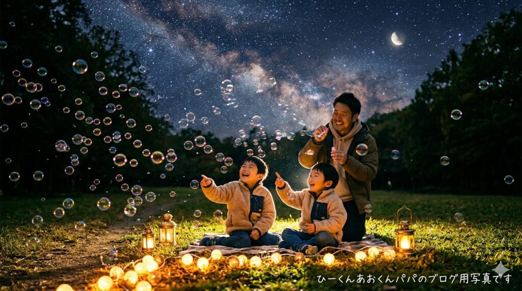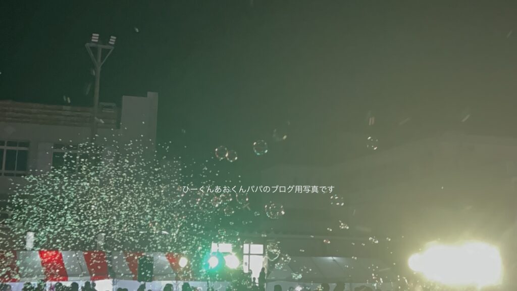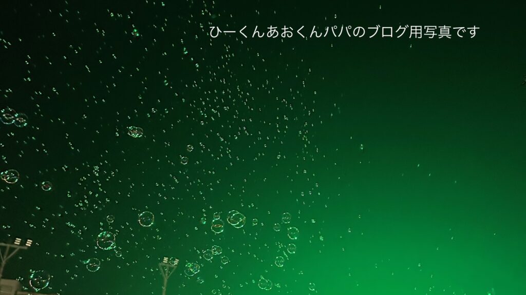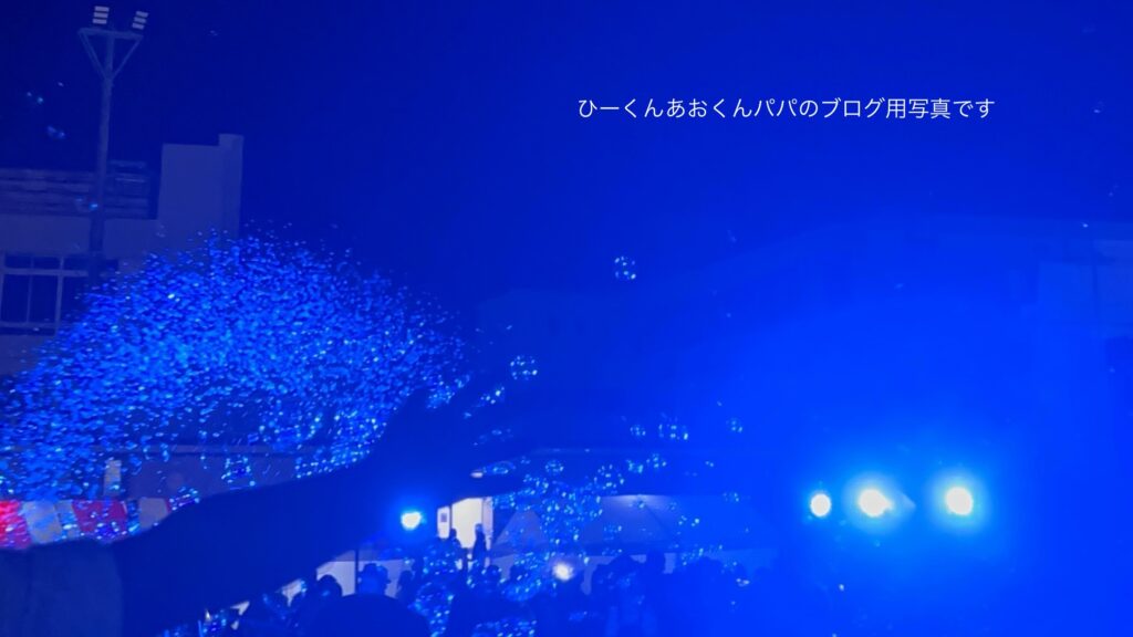 先日、家族で夜に開催された「シャボン玉ショー」を見に行ってきました。昼間、公園で吹いて遊ぶシャボン玉も楽しいですが、夜の暗闇にライトアップされてフワフワと舞うシャボン玉は、まるで無数の宝石が宙に浮いているようで本当に幻想的!ひーくんもあおくんも「うわぁっ!」と目をキラキラさせて大はしゃぎでした。