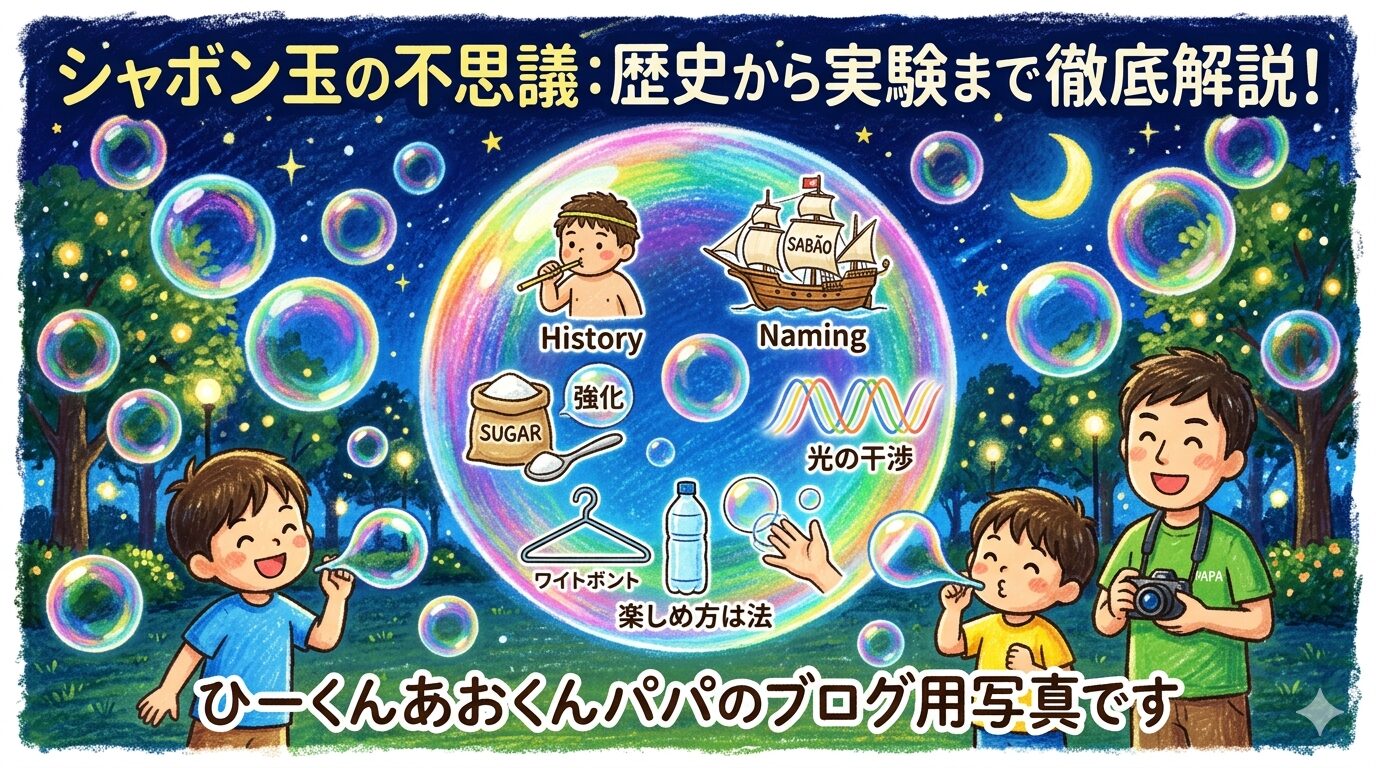 今度の週末は、ひーくんやあおくんと一緒に特製の「強化シャボン玉液」を作り、家中のいろんな道具を持ち出して、お庭で大シャボン玉大会を開いてみてはいかがでしょうか?きっと、今まで見たことのないような最高に輝くシャボン玉と、子どもたちの笑顔が見られるはずですよ!
