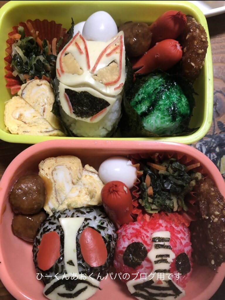 こちらは仮面ライダーガチャードが始まり、仮面ライダーのカードゲームをやり出した頃のキャラ弁ですが、どんどん作って欲しいキャラのリクエストが増えていき、弁当に乗せれなかったキャラもいます💦