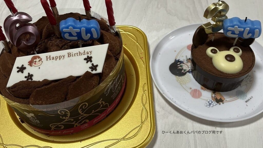 なぜ2つケーキがあるのかといったら、子供達はやはり蝋燭の火は消したいという思いがひしひしと伝わるので、我が家では誕生日者意外の子供達は自分の好きなケーキ買って蝋燭を立てて火を消して食べるって方法を取るようになりました!